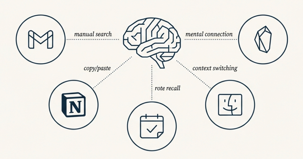 This isn’t just inconvenient - it’s a fundamental limitation of how we build personal software. Tools treat data as isolated silos. The connections between them exist only in your memory.